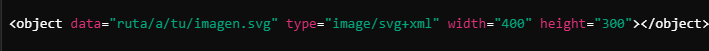 La etiqueta object te permite incrustar un archivo SVG como un objeto independiente en la página. Puedes utilizar la etiqueta object para insertar un archivo SVG y definir el tamaño del objeto utilizando CSS o atributos HTML width y height.