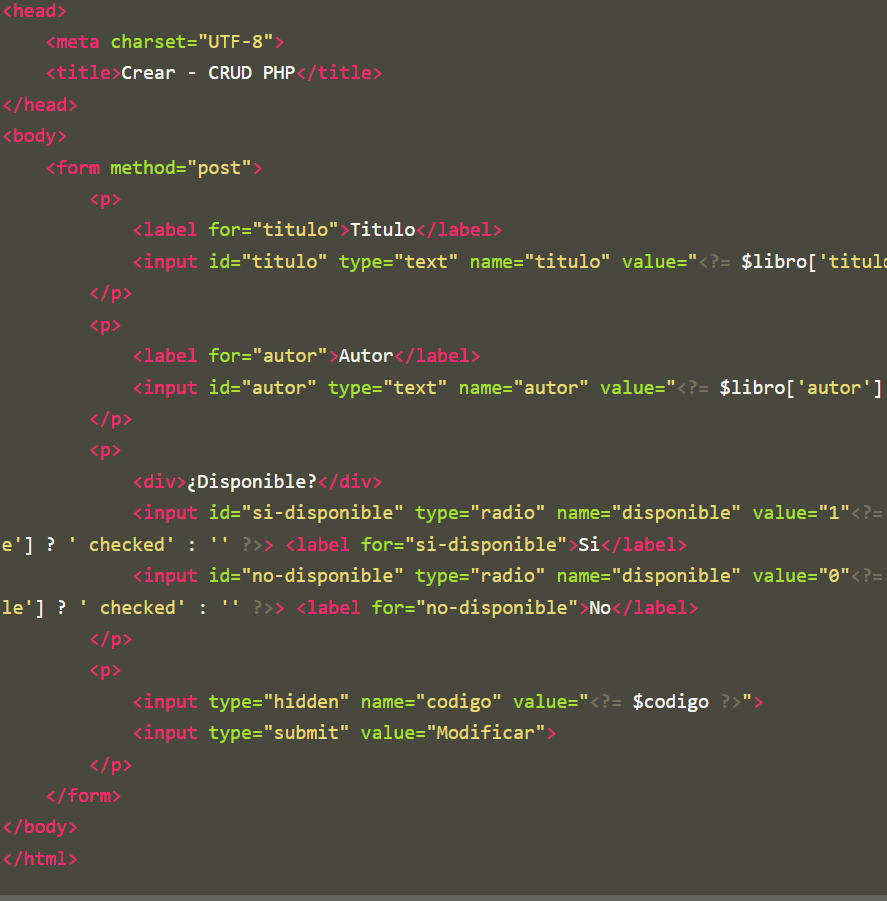 Mientras que nuestro HTML será similar al fomulario de creación salvo que necesitaremos rellenar los value.