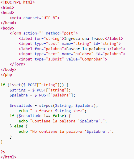 Comprobar si una frase contiene una palabra determinada. Por ejemplo, Si ingresamos la frase "Estoy aprendiendo a programar" en el formulario y la palabra "programar" en el otro campo, el programa imprimirá el siguiente resultado: Contiene la palabra 'programar'.